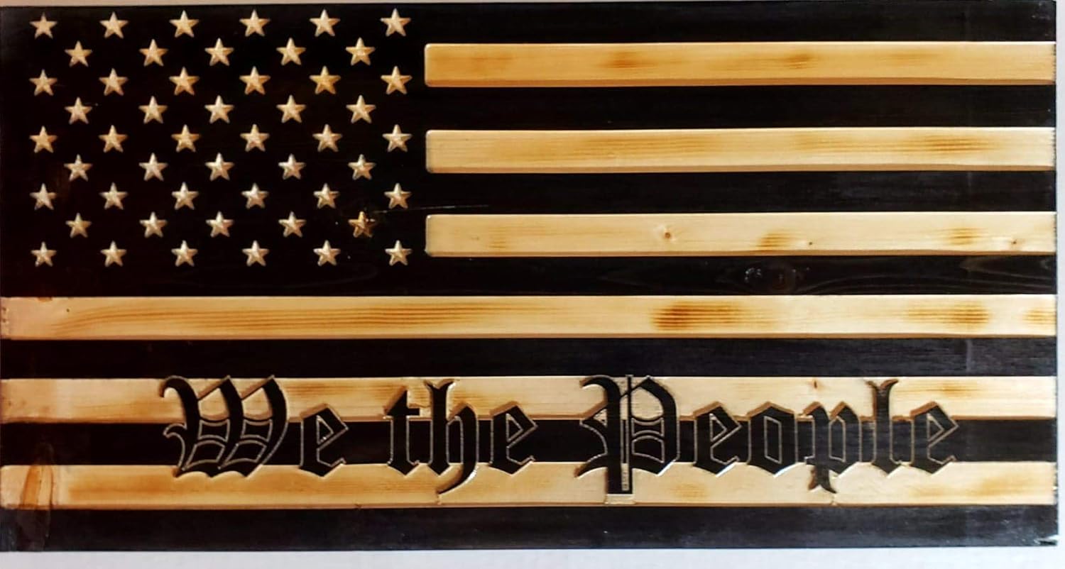 After the flag is carved we lightly torch the exposed wood to give a battle-worn and rustic l These 32x16 flags are carved out of single high-grade pine panels. -The We the People is carved on GruntFlags CNC. Show your pride in the USA by hanging this flag for all to see.